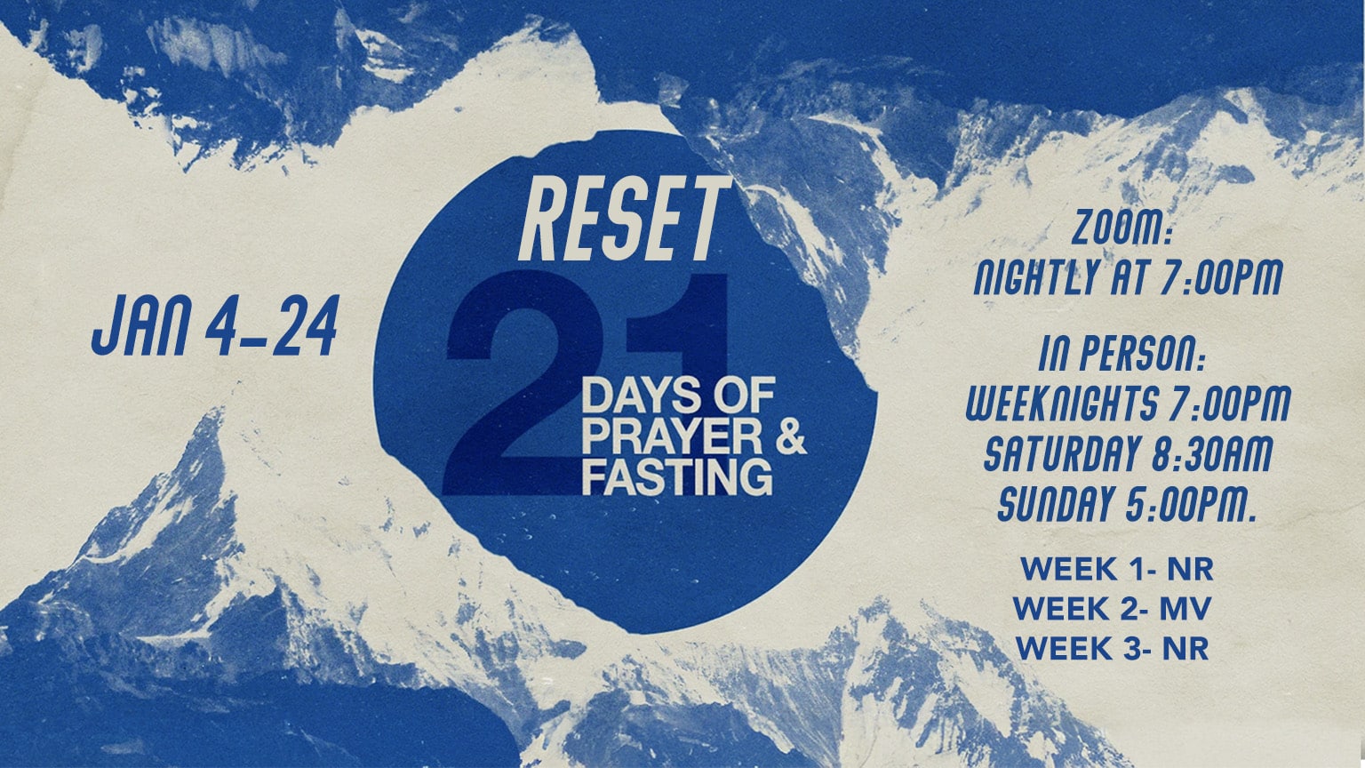 Let's deepen our walk with the Lord as we pray and fast together. We meet daily in-person and on zoom. In-Person: Sunday 5:00 pm Weekdays 7:00 pm Saturday 8:30 am *NR Campus Week 1/4-1/10 & 1/18-1/24 *MV Campus Week 1/11-1/17 Zoom: Nightly 7:00 pm